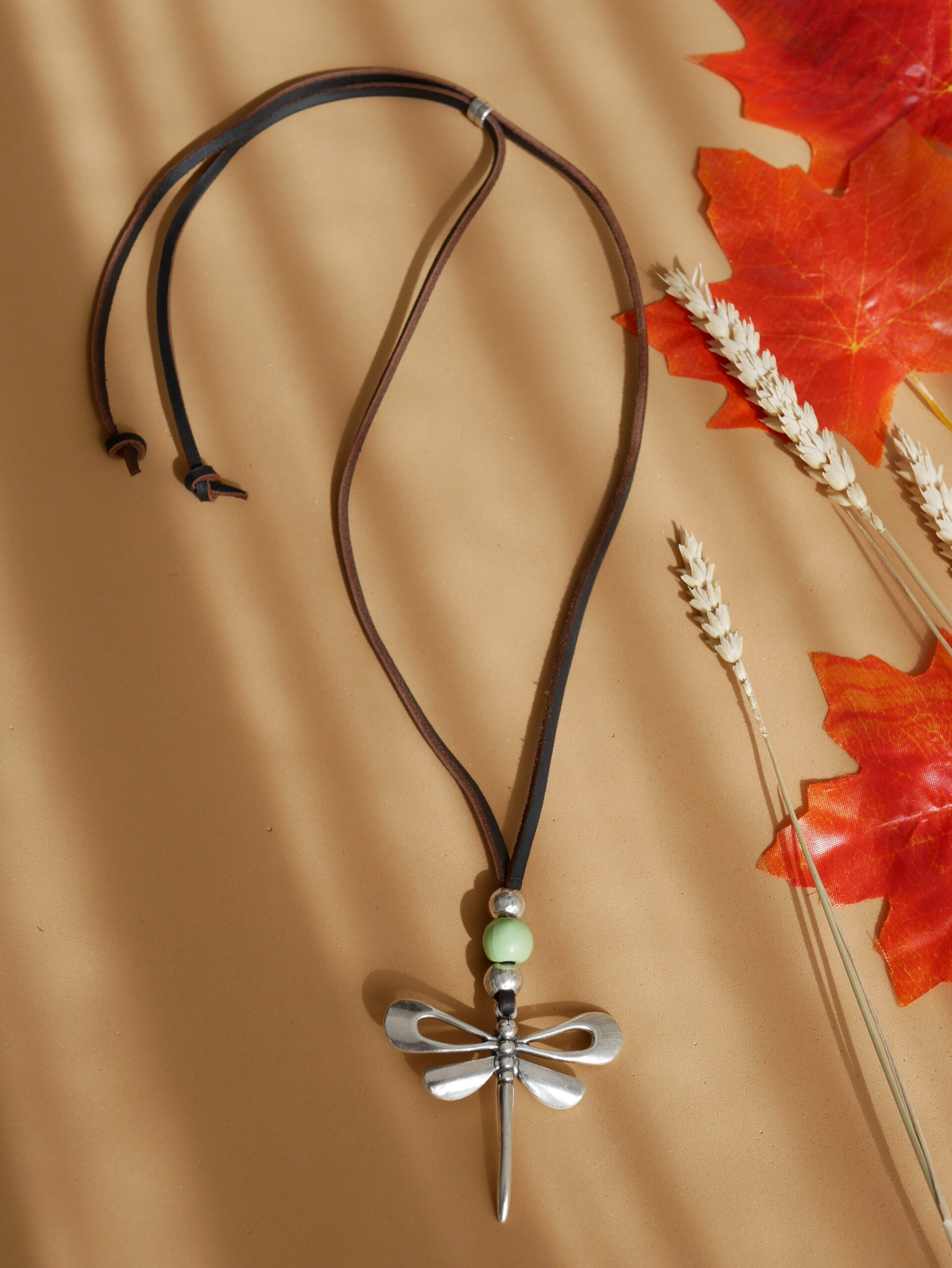 Diseño artesanal con cuero marrón, piedra turquesa y libélula bañado en plata. un símbolo de transformación y libertad, con un estilo elegante y único