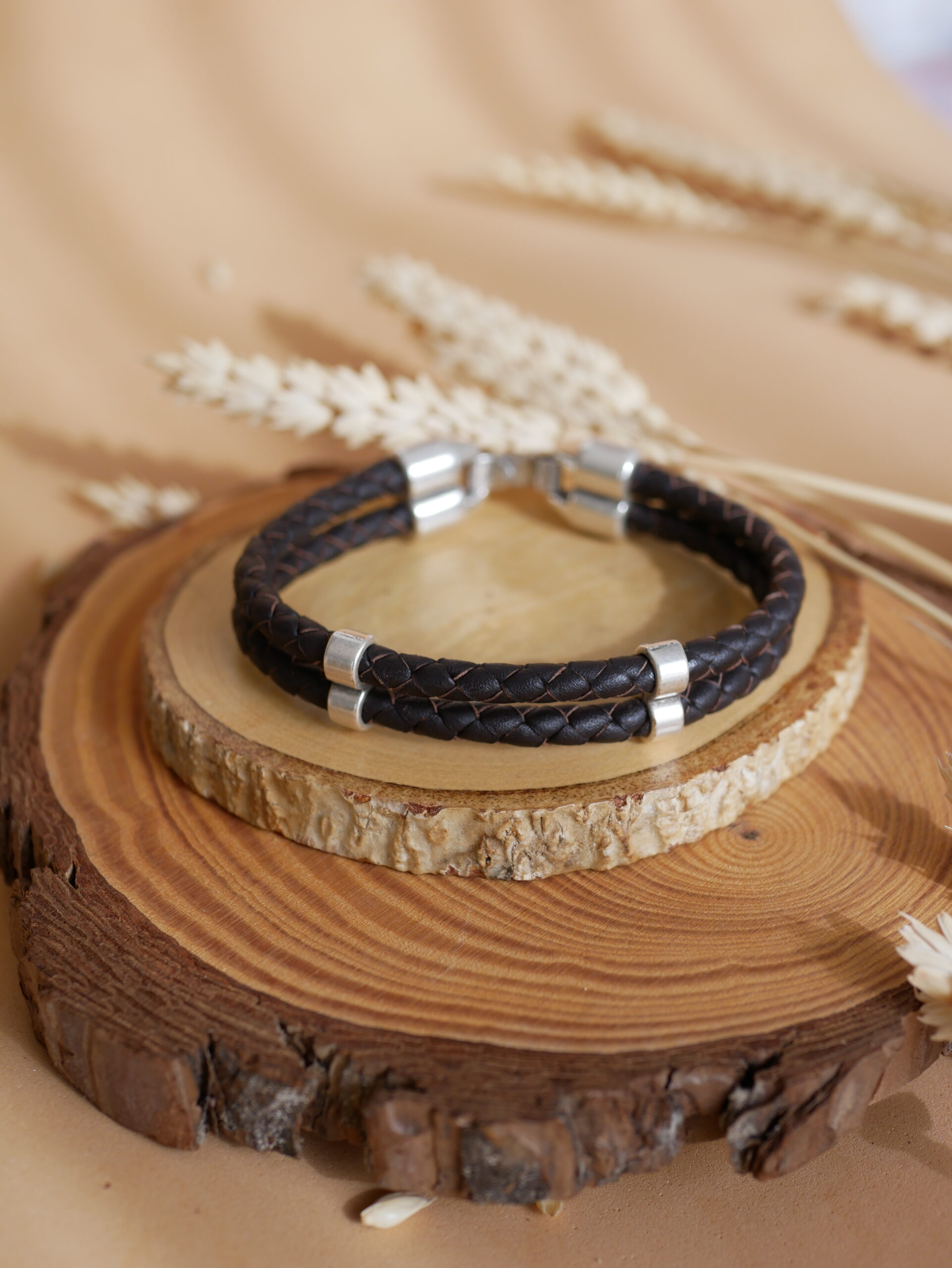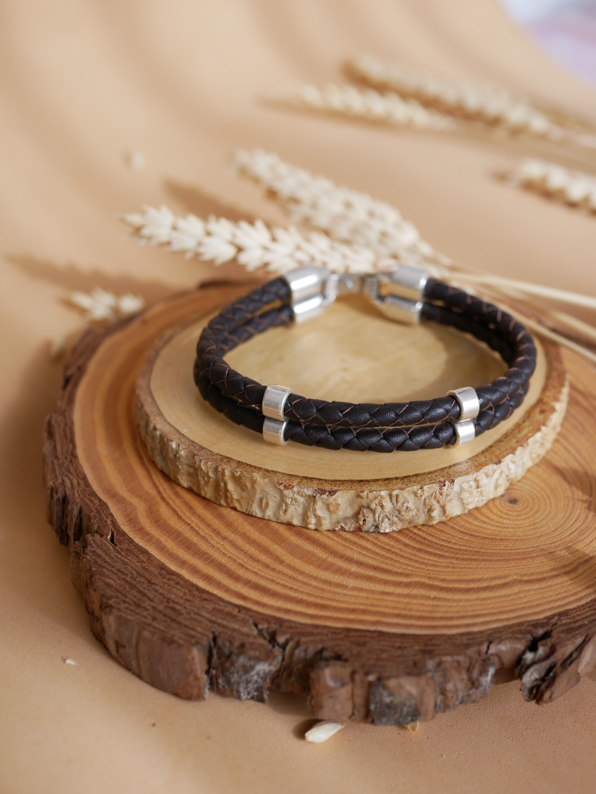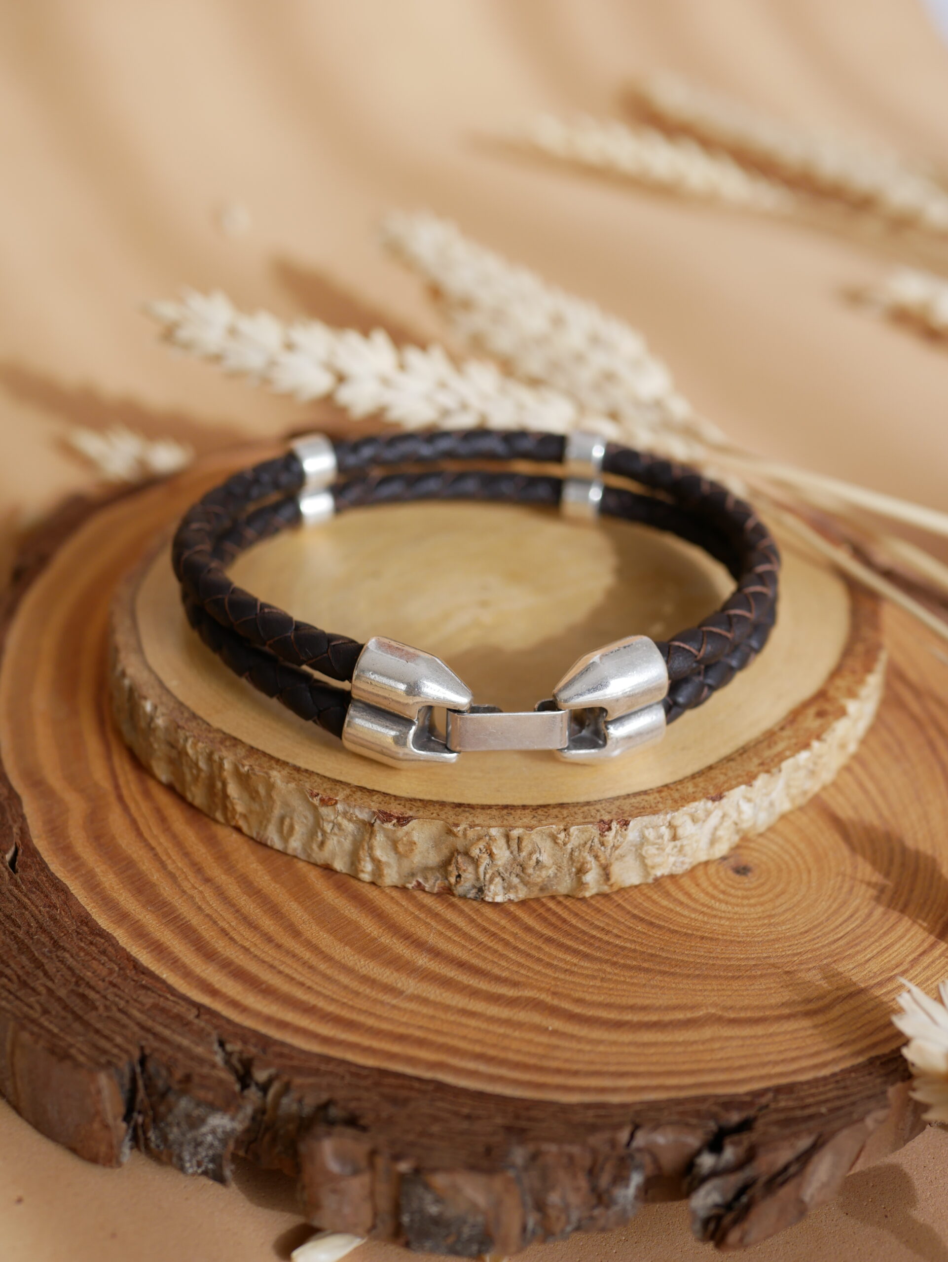 Distinguida pulsera con doble banda de cuero trenzado y adornos bañados en plata que combina la robustez del cuero con un acabado refinado para un look contemporáneo.