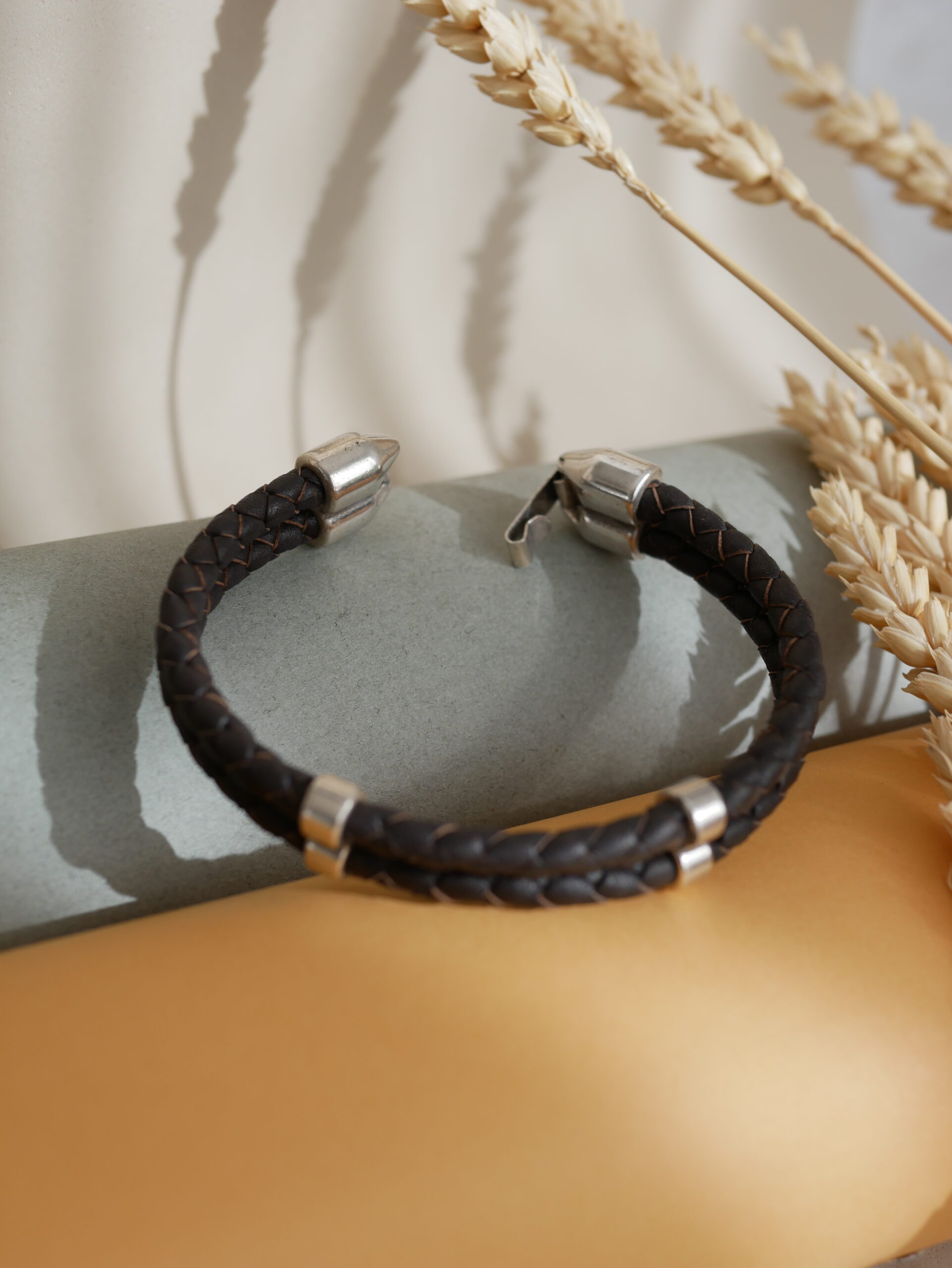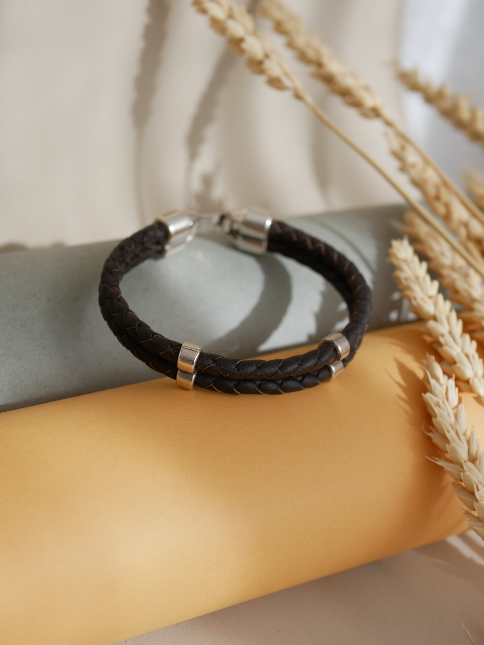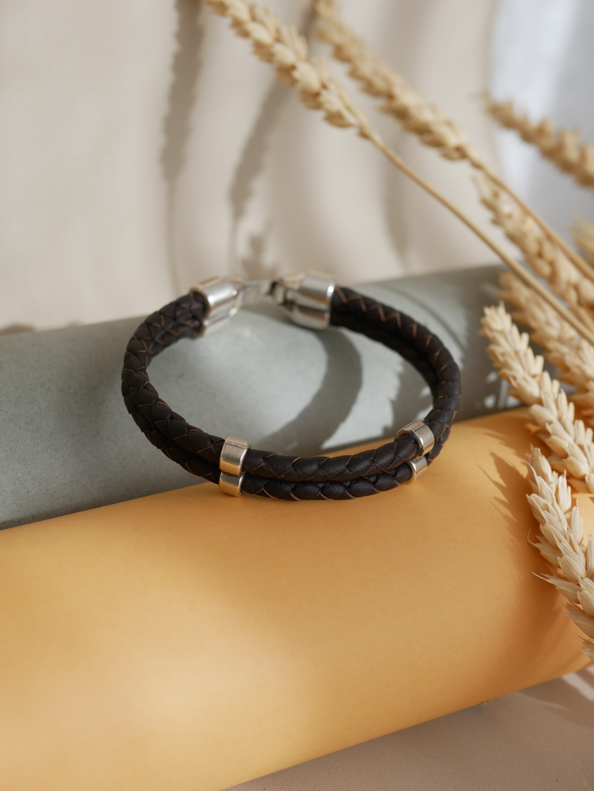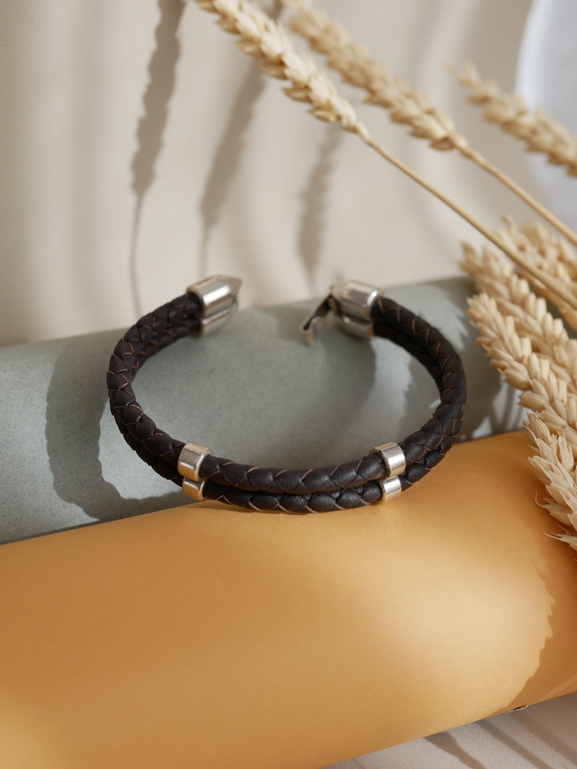 Distinguida pulsera con doble banda de cuero trenzado y adornos bañados en plata. Combina la robustez del cuero con un acabado refinado para un look contemporáneo.